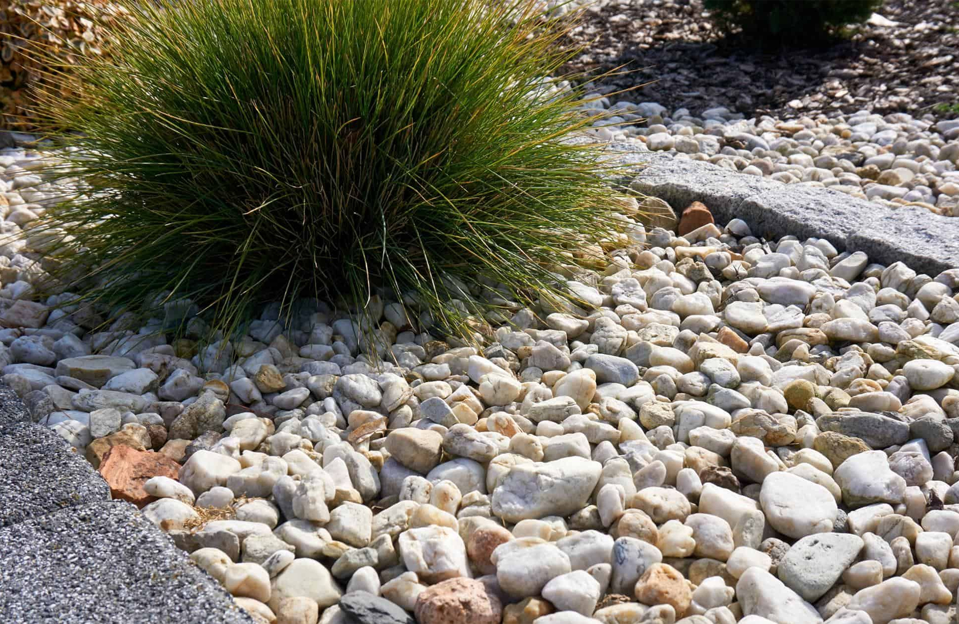 Grand River stone offers consistent sizing and color, creating a polished look. Spread a 2–3 inch layer of river rock around plants or trees for a clean, professional finish.