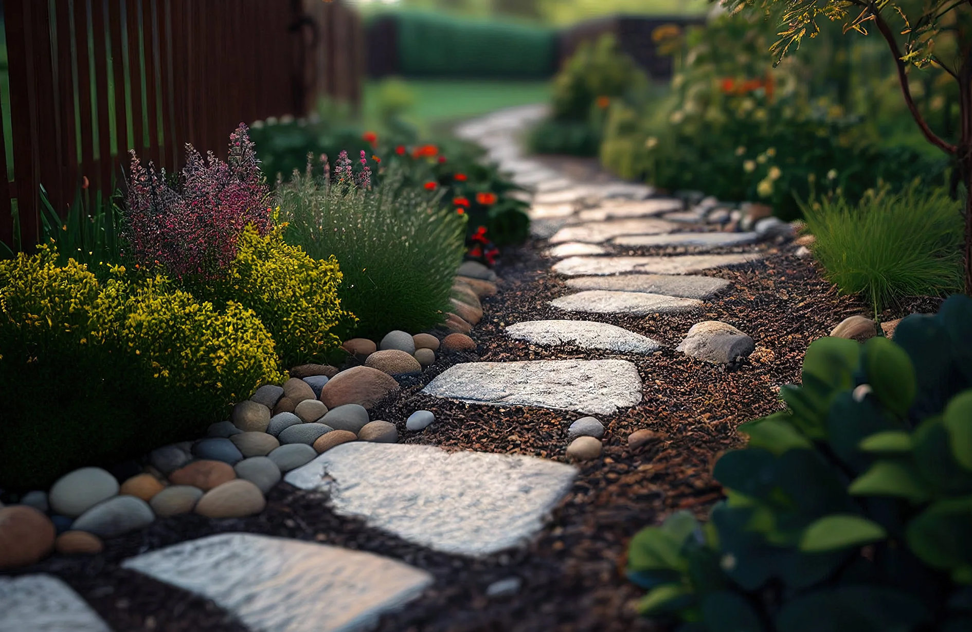 - Mix pea gravel and river stones for textured pathways